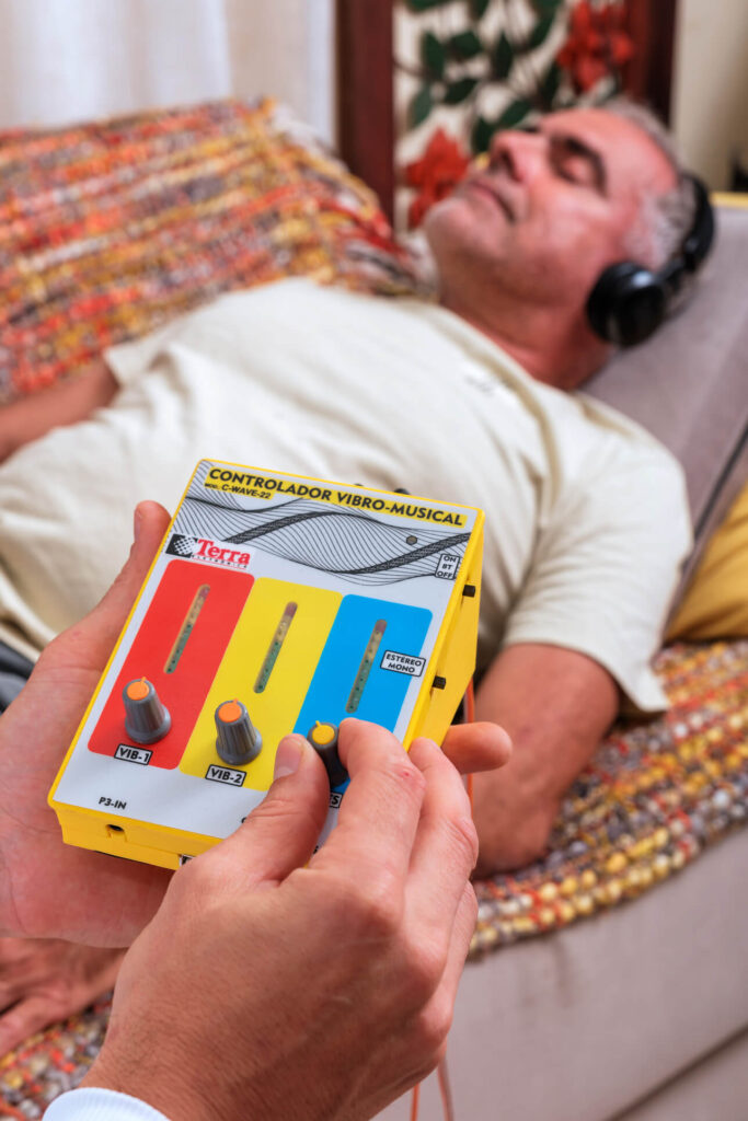 - Uso do Dispositivo: Os programas são disponibilizados sob demanda. O cliente utiliza o dispositivo vibroacústico, seguindo as orientações de uso do terapeuta para otimizar as vibrações terapêuticas.
